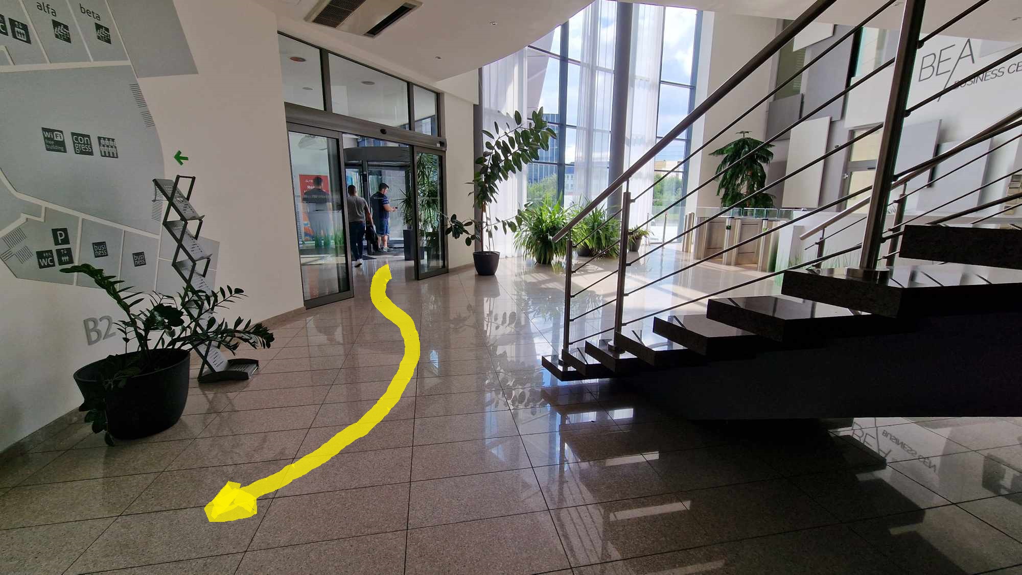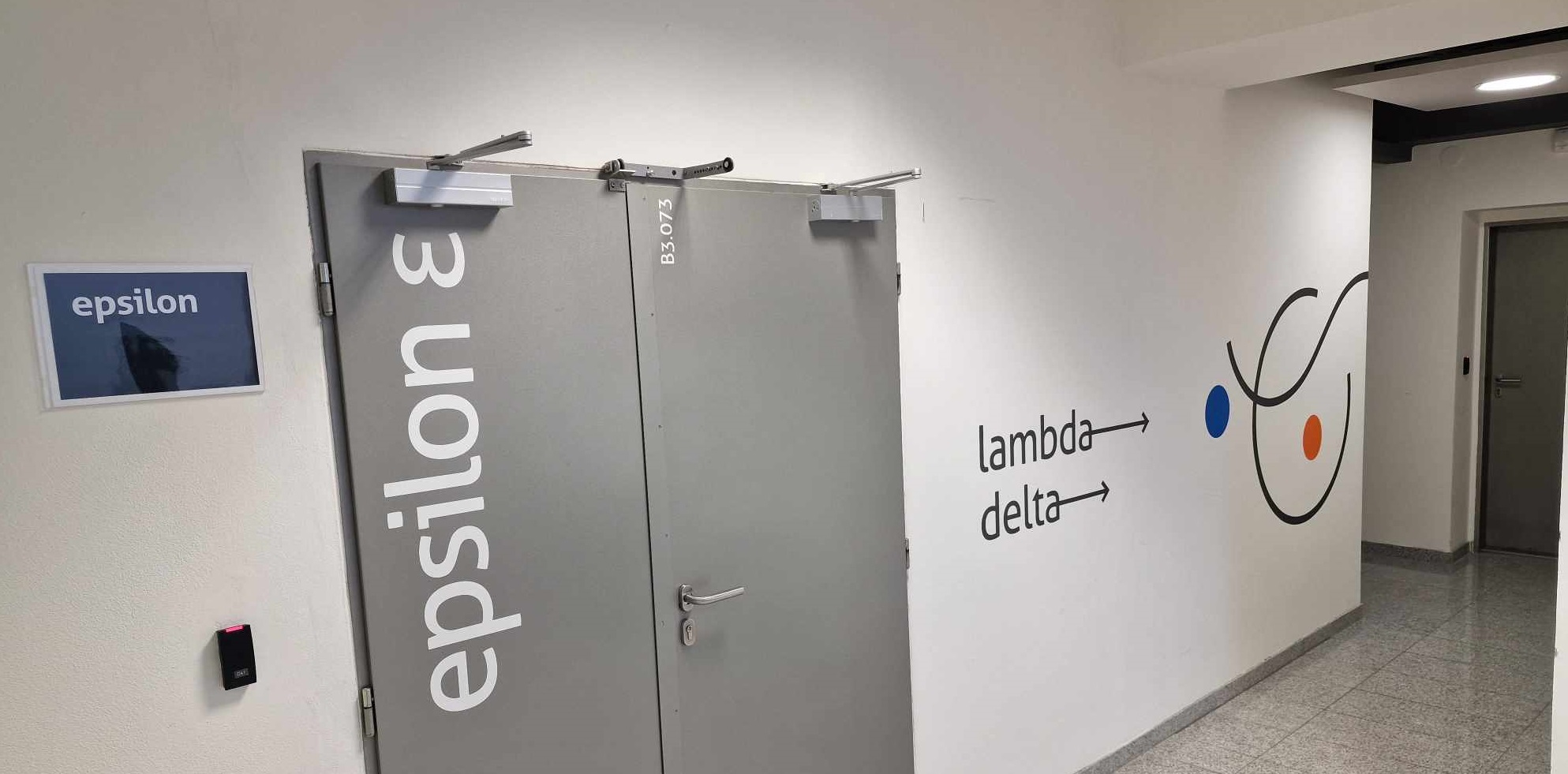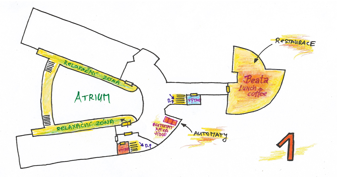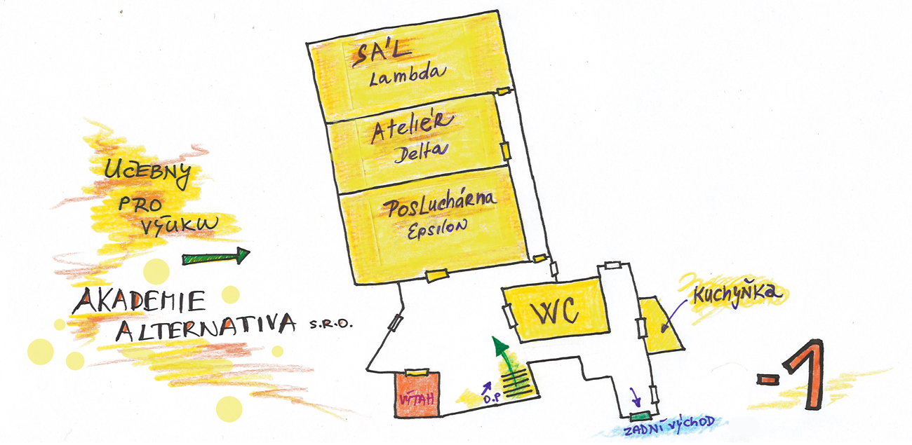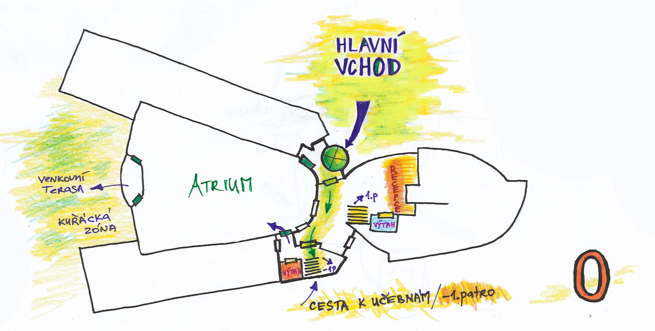 Učebny se nacházejí na spodním podlaží. Do budovy vstupujete hlavním vchodem (viz. foto níže). Přes vstupní prostor pak vcházíte do prostoru s recepcí a při pohledu na recepci zahnete na pravou stranu (k recepci chodit nemusíte, ale můžou vám poradit). Po schodišti sejdete o jedno patro níž. Dole bude hned naproti schodům učebna Epsilon - Posluchárna (viz. - foto výše). Okolo ní bude vpravo vstup na chodbu, kde se nachází dveře do učebny Delta - Ateliér . Na konci chodby je učebna Lambda - Sál.